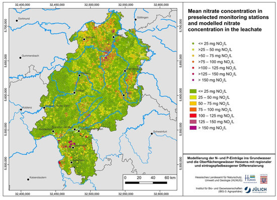 Figure 6 shows an overview of the nitrate concentrations in the leachate modeled across Hesse in the 100 m × 100 m grids and the preselected monitoring wells and springs with nitrate concentrations in groundwater (dots). Since the same class widths and the same color gradation were chosen, the values are visually directly comparable. It becomes apparent that the spatial patterns are reflected very well, i.e., the regions with high nitrate concentrations in the groundwater and springs are just as well represented by the modeled nitrate concentrations in the leachate as the regions with low nitrate concentrations in the groundwater and springs.