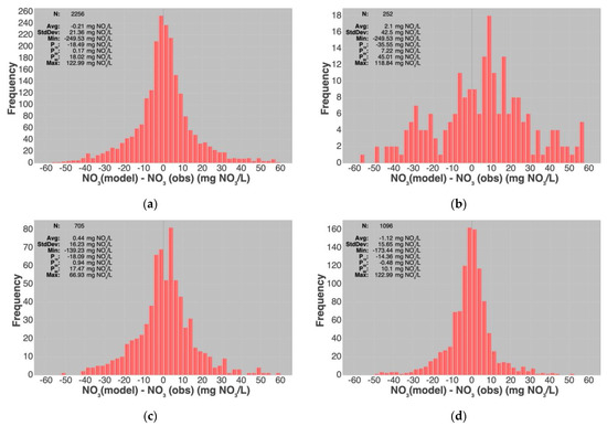 The frequency distribution over all 2256 monitoring stations in Figure 7a shows that half of the modeled nitrate concentrations in the leachate deviate less than 0.17 mg NO3/L from the observed values, and 75% less than 7 mg NO3/L. This can be considered as a good agreement, which is confirmed by the standard deviation of 21.5 mg NO3/L. The scatter shows a relative normal distribution, indicating that the modeled nitrate concentrations in the leachate show neither a tendency to overestimate nor to underestimate.