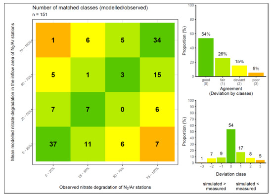 For this reason, a preselection method is applied to identify suitable groundwater monitoring wells from the upper aquifer and springs whose observed nitrate concentrations may be compared to the modeled nitrate concentrations in the leachate [46]. The preselection criteria are the exclusive inclusion of monitoring wells filtered near the surface (up to 30 m below GWO), as well as the exclusive inclusion of groundwater monitoring wells and springs indicating an oxidative milieu. By applying these preselection criteria to the data from the network of the Hessian groundwater monitoring wells and springs for controlling the chemical status of groundwater, 2256 groundwater monitoring wells and springs were identified as suitable for the plausibility check. For these groundwater monitoring wells and springs, the mean values are derived from the individual nitrate measurements and compared to the modeled mean nitrate concentration in the leachate of the inflow area of the corresponding measuring point or spring.