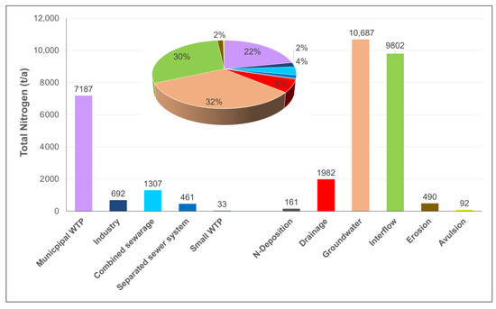 Nitrogen output from soil that does not reach surface waters via direct runoff enters the aquifer via groundwater recharge. In the WEKU model [82,83], the N input into the groundwater is assumed to be a proportion of the N output from soil equal to the proportion of groundwater recharge in the total runoff. In addition to the soil-borne N inputs to groundwater, N emissions from leaking urban systems and small wastewater treatment plants discharging into groundwater are considered as additional N sources to groundwater.