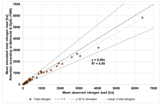 In the hydrological water balance, the leachate rate corresponds to the amount of water that is neither lost due to evapotranspiration nor discharged as surface runoff. Since the share of surface runoff in the total runoff in Germany is insignificant at the catchment level [106], the leachate rates are generally of the same order of magnitude as the total runoff rates. Accordingly, the plausibility check of the total runoff (Figure 4) indirectly validated the modeled leachate rate. This fact is significant because the leachate rate is an important parameter for calculating the nitrate concentrations in the leachate and assessing the nitrate pollution risk in a region.