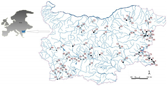 Biological data for a 5-year period (2016–2020) from 367 river sites (15 river types) in Bulgaria were subjected to a comparative analysis. National river types were defined as a total of 16 according to hydromorphological and biological criteria [12]. Most of the sites had the same macrophyte- and macroinvertebrate-based assessment expressed as the ecological quality ratio (EQR) (n = 146) or the assessment was with a difference of one degree (n = 191) between two biological quality elements (BQEs). We selected 83 sites sampled during the most recent year, i.e., 2020 (Figure 1, Supplementary Table S1).