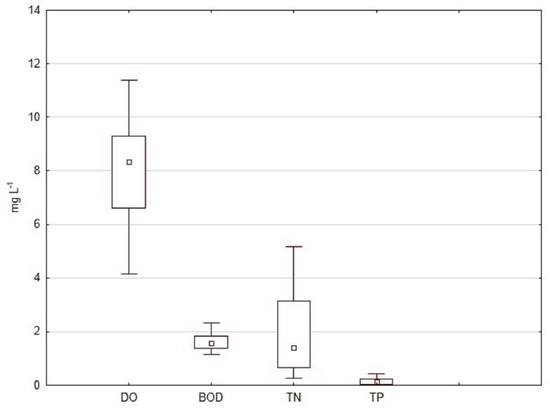 STATISTICA 7 software was applied to generate box plots. Analyses were undertaken using the software statistical package CANOCO 4.5 for Windows [21]. Redundancy analysis (RDA) can be considered a multivariate form of regression analysis whereby the response data are modeled as a function of one or more ordination axes that are constrained to be linear combinations of the environmental variables, depending on the extent of the number of taxa and EQR turnover along the ordination axes. We applied detrended correspondence analysis (DCA), using the option “detrendingby-segment”, which allowed the gradient length of species variance along orthogonal axes to be quantified in terms of standard deviation units. The first axis in our data had a length of 0.6 SD of the number of taxa and 0.7 of EQR, suggesting modest unimodality according [21]. Therefore, we used linear direct analysis. RDA was used to examine relations between the species richness of macrophyte and macroinvertebrate communities and abiotic parameters and physico-chemical stressors. A canonical correspondence analysis (CCA—unimodal analysis with forward variable selection) was used to present the interactions between 57 macrophyte species and 19 macrozoobenthic taxonomic groups with environmental factors at the studied site.