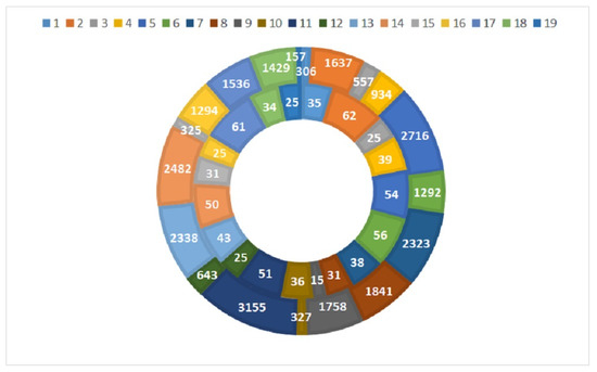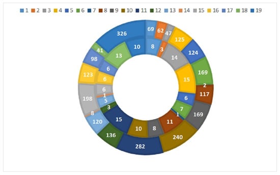 The fewest benthic taxa were found at site 9, where more tolerant taxa (representatives of the classes Amphipoda and Gastropoda and the orders Odonata, Heteroptera, and Diptera) mostly prevailed. Site 11 was characterized by the greatest abundance (3155), which is due to the dominance of class Bivalvia, class Gastropoda, order Amphipoda, order Isopoda, order Arachnida, and order Odonata. The lowest abundance (157) was recorded at site 19, where orders Ephemeroptera, Plecoptera, and Trichoptera were poorly represented, mainly with tolerant taxa.