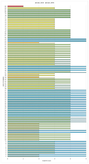 EQR = {(RI + 100) × 0.5}/100. The Irish biotic index [16,17,18] and its adapted Bulgarian version [19,20] were used for the ecological status determination of the studied river types/sites using macrozoobenthos. The biotic index (BI) includes two metrics: the total number of taxa and taxa richness of indicator groups A (very sensitive), B, C, D, and E (very tolerant). The individuals were counted, and the abundance was divided into five abundance classes: few (1–5), present (6–20), common (21–50), plentiful (51–100), and dominant (100+). The values of the BI depend on the relative proportions of the tolerance groups. EQR is calculated as the ratio between the observed index value and the index value which was defined for reference sites [19,20].