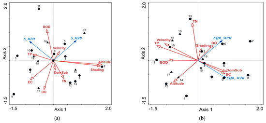 (a) RDA ordination triplot with species richness (S_MPH, S_MZB), four abiotic characteristics, and six physico-chemical stressors. Legend: black circles—natural; black triangles—HMWBs. (b) RDA ordination triplot with macrophyte- and macroinvertebrate-based assessments (EQR_MPH, EQR_MZB), four abiotic characteristics, and six physico-chemical stressors. Legend: black circles—natural; black triangles—HMWBs.