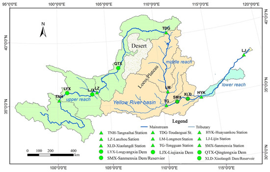 The Yellow River, which originates from the Qinghai–Tibetan Plateau, traverses the Loess Plateau and the North China Plain, finally flows into the Bohai Sea (Figure 1), has a total length of 5464 km and a total drainage area of 0.75 million km2 [4,25]. The river basin is commonly divided into the upper (above Toudaoguai), middle (from Toudaoguai to Xiaolangdi), and lower (below Xiaolangdi) reaches with a channel length of 3472, 1206, and 786 km and a drainage area of 0.39, 0.34, and 0.02 million km2, respectively [19,26]. The annual mean runoff produced in the three reaches accounts for 54%, 36%, and 10% of the total runoff of the Yellow River basin, while the annual mean suspended sediment yield from the river reaches accounts for 10%, 88%, and 2% of the total annual mean suspended sediment load.