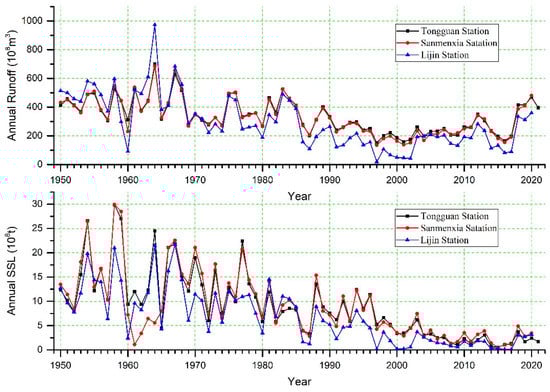 The annual runoff and SSL during the time period from 1950 to 2021 were examined at the Tongguan, Sanmenxia, and Lijin stations in the Yellow River (Figure 2). The runoff fluctuated with a low amplitude and had no significant trend of change in the 1950s, while it fluctuated greatly in the 1950s and its maximum value appeared in 1964. The runoff showed a trend of decreasing with minor fluctuations during 1964–1997 and an increasing trend in the time period of 1997–2021. The annual SSL at the three stations presented an overall decreasing trend and their interannual fluctuations also decreased with time (Figure 2). Compared with the three hydrological stations, the values and variation characteristics of the Tongguan and Sanmenxia stations were very similar in terms of annual runoff and SSL.