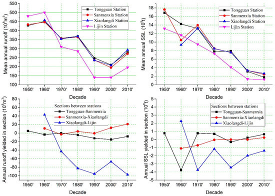 The mean annual runoff and SSL at four gauging stations (Tongguan, Sanmenxia, Xiaolangdi, and Ljin) as well as the net water and sediment yield in three sections (Tongguan–Sanmenxia, Sanmenxia–Xiaolangdi, and Xiaolangdi–Ljin) in different decades are shown in Figure 3.
