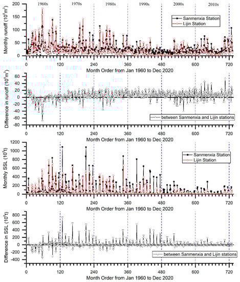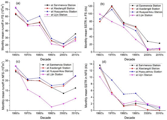 - During the flood season (from July to October) in the last four decades of the last century, the monthly mean runoff and SSTR in decadal average also showed a significant trend of decreasing, especially in the 2000s and 2010s. The maximum value of the monthly mean sediment inflow coefficient in a decadal average was in the 1990s while the sub-maximum was in the 1970s for the typical hydrological stations, but the minimum and sub-minimum were in the 2000s and 2010s, respectively, except for the Sanmenxia Station. This was a comprehensive response to the environmental protection measures in the Yellow River basin, in which the construction and operation of the Xiaolangdi Reservoir played a key role.