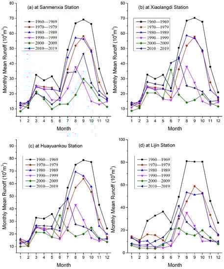 Distribution curves of the monthly runoff in decadal average at the Sanmenxia, Xiaolangdi, Huayunakou, and Lijin gauging stations of the Yellow River.