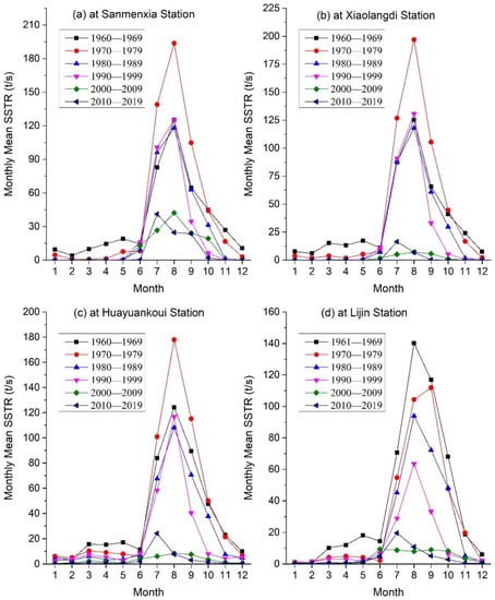 For the Xiaolangdi hydrological station, the distribution curve of the monthly mean SSTR in the four decades of the 20th century (Figure 7b) was almost the same as that of the Sanmenxia station, but in the 2000s and 2010s, it was quite different from that of the Sanmenxia station in the same period. The main differences are that the monthly mean SSTR during the flood season significantly decreased, and there was no significant difference compared to other months. The mean SSTR during the flood season in these two decades only accounted for 6.0% and 7.5% of that during the same period in the 1960s.