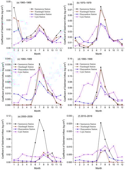 Compared with that of the 1960s, the sediment inflow coefficient significantly increased in the summer and autumn periods in the 1970s while it significantly decreased in the winter and spring, with a larger seasonal fluctuation range (Figure 8b). This is mainly due to the fact that the sediment trap capacity of the Sanmenxia Reservoir almost disappeared and the storage capacity also was greatly consumed by sediment deposition. In the 1980s, the sediment inflow coefficient in each month was lower than that in the 1970s, and in the non-flood season, it was also lower than that in the 1960s (Figure 8c). This was mainly due to the joint operation of the Liujiaxia Reservoir and the Longyangxia Reservoir located in the upper reach of the Yellow River to reduce the flood peak. The sediment inflow coefficient in the flood seasons of the 1990s and 2000s (Figure 8d,e) was the highest and second highest among these decades. In the 2010s (Figure 8f), the sediment inflow coefficient at the Sanmenxia station was only slightly higher in July than in the same period of the 1960s, while the other months had the smallest values among all months in all decades. At the same time, their monthly variability was also the smallest.