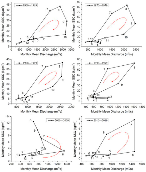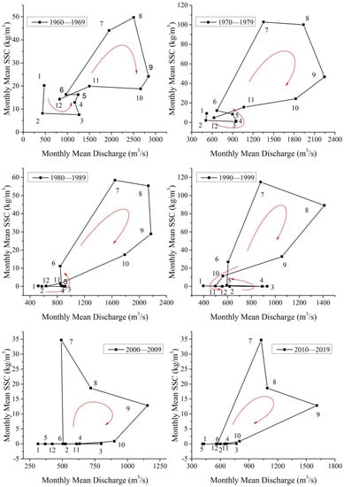 In the 2010s, there was a counterclockwise loop characterized by a convex quadrilateral shape (Figure 10). The changes in the water sediment relationship mainly occurred in July and August, indicating that during the period from June to July, the monthly mean water discharge increased at a low speed, while the monthly mean sediment concentration increased at a high speed. During the two periods from July to August and August to September, the water discharge was decreasing, while the sediment concentration was decreasing at lower and higher rates, respectively. In other months, the monthly mean sediment concentration did not change significantly with the monthly mean discharge.