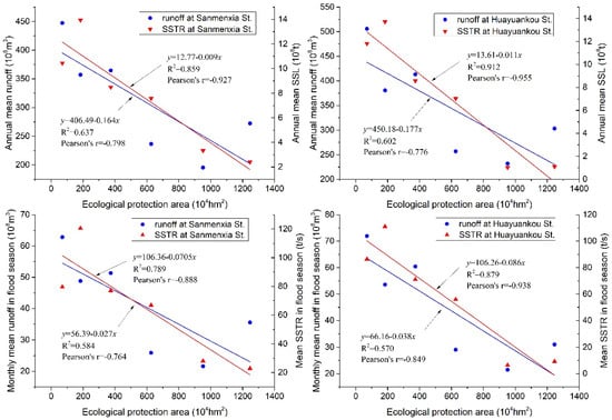 Relationships between the decadal means of annual runoff and SSTR and monthly runoff and SSTR in flood season and the ecological protection area in the Yellow River basin.