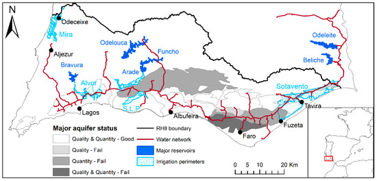 Algarve region of Portugal (red box in inset) showing the locations of key surface water reservoirs and the multimunicipal water supply network along with major aquifers and their proposed status under the 3rd River Basin Management Plan and the surface-water-fed irrigation perimeters.