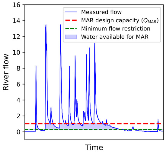The concept of water available for MAR (WAFM) is demonstrated in Figure 2, where water can be captured from a river only once a minimum flow condition (QMIN), i.e., an environmental constraint, is exceeded until the maximum design capacity of the proposed MAR scheme is reached. Flows above this level cannot be captured unless the design capacity (QMAR) is increased.