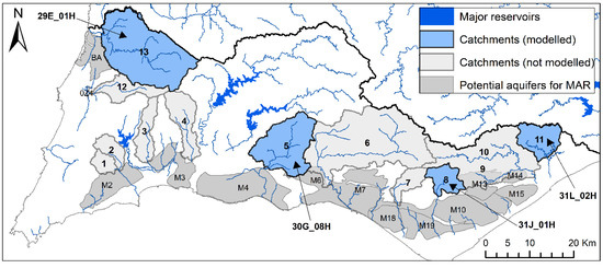Location of potential catchments (modelled and nonmodelled) and potential aquifers for MAR. Catchments references and aquifer codes are detailed in Table 1, with the gauging station used for model calibration annotated e.g., 29E_01H.