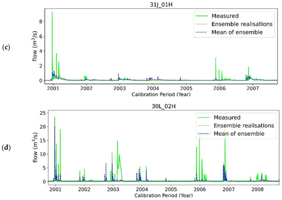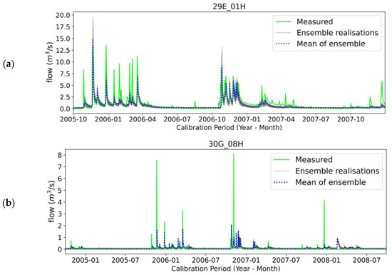 Modelled flows are shown in Figure 4 for the ensemble mean and all members compared to the measured flows during the calibration period(s). Catchment-specific calibration periods were selected based on the availability and quality of the measured data. The timing and duration of the flow events are reasonably well matched, although the modelled flows cannot match the recorded peak flows. There are also some instances where flow events occur in the data that are not recorded by the model, possibly reflecting areal variations in the intensity of rainfall that are not seen in the catchment averaged rainfall data.