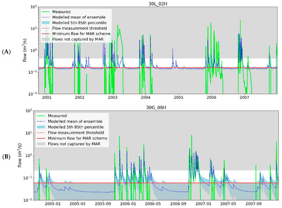 Measured vs. modelled river flows on log scale for 30L_02H (Ribeira de Almargem) (A), and 30G_08H (Ribeira da Alcantarilha) (B), demonstrating the selection of QMIN at the point where measured and modelled flows diverge to address model limitations.