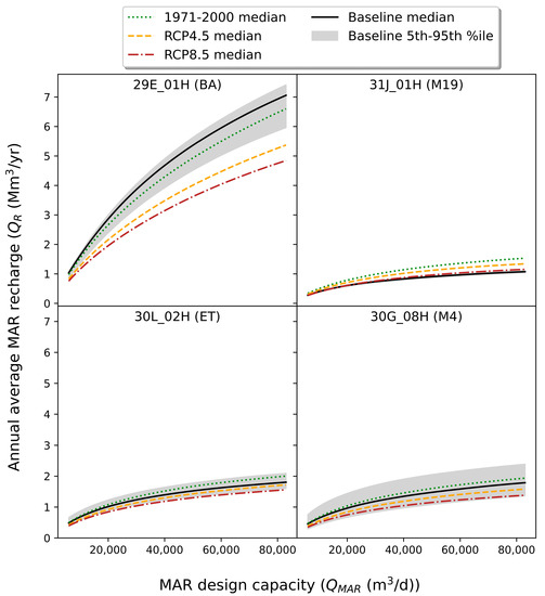 For the baseline period (2000–2021), the annual average MAR recharge (QR) achieved for each of the modelled catchments based on a range of MAR design capacities, QMAR, are shown in Figure 6. The median of the ensemble is presented along with the 5–95th percentile values, indicating that uncertainty in QR varies considerably, from very little at 31J/01H (Rio Seco), to >1 Mm3/yr at QMAR of 40,000 m3/d for 30G_08H and 29E_01H. The uncertainty is positively correlated with river flow and reflects the increased measurement error at higher flow rates.