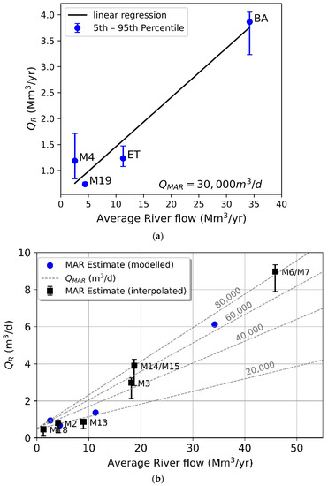 For catchments that were not modelled, a linear regression was used to relate annual average river flow to annual average QMAR for a range of potential MAR design flows (QMAR) for the modelled catchments.