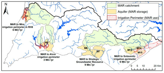 The Mira irrigation perimeter covers 1855 ha within RH8, south of the River Seixe and is supplied with only 1.5 Mm3/yr from Santa Clara reservoir (of 30–37 Mm3/yr total), along the Canal do Rogil [51]. Therefore, MAR can form >100% of the demand in the irrigation perimeter in RH8 and, furthermore, MAR could form 20% of the total Mira irrigation demand. MAR in RH6 (Alentejo) has not been considered as part of this work; however, the same permeable formations are known to occur in this region and in addition to the River Seixe, the water not used for irrigation from Santa Clara (during the winter months, but still released into the irrigation network) could be an additional source of water for MAR. A strategic transfer of water from the Santa Clara dam to the Algarve (via the Rogil canal) is already being considered as one of the long-term measures considered in the RWEP, and potentially this could be augmented/replaced by MAR in this area.