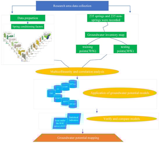 There are four main steps in this research (Figure 2): (1) Describe the study area and prepare groundwater potential conditioning factors; (2) use GIS software to extract the main control factors that affect the potential of groundwater and draw related layers; (3) optimize the selected model and select the best parameters for groundwater potential modeling; (4) use a ROC curve to verify the generated groundwater potential map.