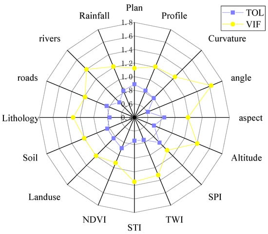 Multicollinearity refers to the phenomenon where two or more impact factors are highly correlated in the regression model [47]. When there is a multicollinear relationship between the selected conditioning factors, the established model will find it difficult to accurately estimate the results. Therefore, the influencing factors with collinearity should be eliminated before modeling. It is generally determined by the variance inflation factor (VIF) and tolerance (TOL) [48,49]. VIF is the reciprocal of TOL [50]. The larger the VIF, the smaller the TOL, indicating that the collinearity is more serious [51].