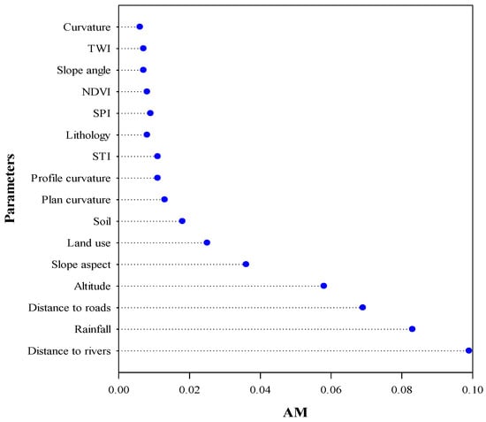 Subsequently, the importance of each impact factor is calculated based on the ReliefF method [75]. The algorithm can handle multi-class problems and regression problems where the target attribute is a continuous value [76]. ReliefF method results show that distance to rivers has the greatest impact on groundwater potential (AM = 0.099), while curvature has the smallest influence on groundwater potential (AM = 0.006) (Figure 4).