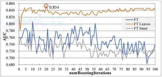 There are three types of FT models: FT, FTLeaves, and FTInner. All model types require tuning of the parameter numboostingiteration (numBoostingIteration represents setting a fixed number of iterations for LogitBoost). Record the AUC values corresponding to each parameter on the curve. The optimization curves corresponding to these three model types are shown in Figure 7.