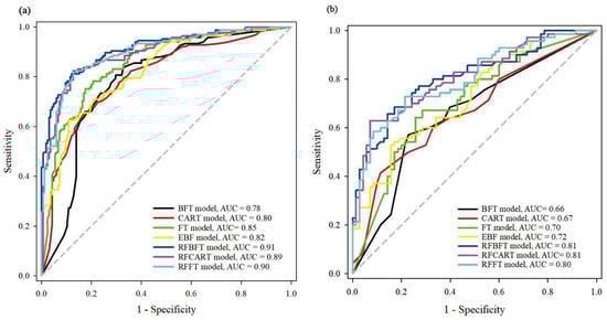 Parameters of ROC curves with a training dataset (Table 2): It can be seen that in the training data set, all seven models have good predictive capabilities. Among them, the RF-BFT model has the highest AUC value (0.911), followed by the RF-FT model and the RF-CART model, at 0.898 and 0.894, respectively. In addition, Table 3 also describes the standard errors (SE) of these 7 models and the upper and lower limits of the asymptotic 95% confidence interval. These results all show an error value within the normal range. The p values in Table 3 are all <0.0001, indicating that the result is significant.