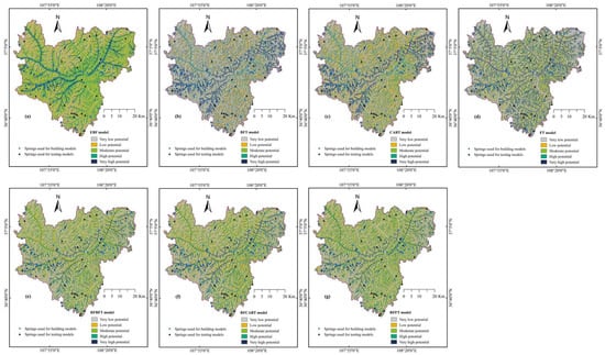 Groundwater potential mapping is an important prerequisite for evaluating the exploitation, utilization, and recharge of groundwater. The study uses BFT (best-first decision tree classifier), CART (classification and regression tree), FT (functional trees), EBF (evidential belief function) benchmark models, and RF-BFTree, RF-CART, and RF-FT ensemble models to map the groundwater potential of Wuqi County, China. Firstly, select sixteen groundwater spring-related variables, such as altitude, plan curvature, profile curvature, curvature, slope angle, slope aspect, stream power index, topographic wetness index, stream sediment transport index, normalized difference vegetation index, land use, soil, lithology, distance to roads, distance to rivers, and rainfall, and make a correlation analysis of these sixteen groundwater spring-related variables. Secondly, optimize the parameters of the seven models and select the optimal parameters for groundwater modeling in Wuqi County. The predictive performance of each model was evaluated by estimating the area under the receiver operating characteristic (ROC) curve (AUC) and statistical index (accuracy, sensitivity, and specificity). The results show that the seven models have good predictive capabilities, and the ensemble model has a larger AUC value. Among them, the RF-BFT model has the highest success rate (AUC = 0.911), followed by RF-FT (0.898), RF-CART (0.894), FT (0.852), EBF (0.824), CART (0.801), and BFtree (0.784), respectively. Groundwater potential maps of these 7 models were obtained, and four different classification methods (geometric interval, natural breaks, quantile, and equal interval) were used to reclassify the obtained GPM into 5 categories: very low (VLC), low (LC), moderate (MC), high (HC), and very high (VHC). The results show that the natural breaks method has the best classification performance, and the RF-BFT model is the most reliable. The study highlights that the proposed ensemble model has more efficient and accurate performance for groundwater potential mapping.