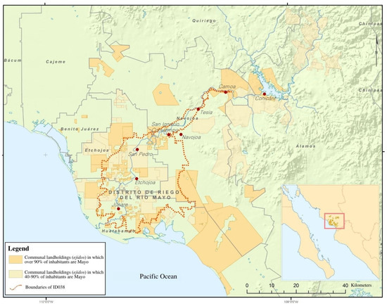 The Rio Mayo Irrigation District includes three municipalities—Navojoa, Etchojoa, and Huatabampo—and has a population of 303,378 [3]. Two principal ethnic groups are distinguished in the region: the Mayo indigenous group of prehispanic origin, and the non-indigenous population (locally known as Yori, according to the Mayo term), including descendants of European colonizers as well as mestizos. As a result of centuries of inmigration, cultural mixing, and demographic growth, the non-indigenous inhabitants make up 83% of the population, while the remaining 17% consider themselves to be indigenous [36]. The current Mayo population, estimated at 65,000, is concentrated in the riverside villages of the Rio Mayo, particularly in eight traditional villages, i.e., Conicarit, Camoa, Tesia, Navojoa, San Ignacio Cohuirimpo, San Pedro, Etchojoa, and Júpare, all of which fall within Rio Mayo Irrigation District (see Figure 1). Their culture revolves around the Rio Mayo, and their political organization is based on their traditional village governments which principally coordinate ceremonial matters, as well as on the territorial organization of their collective landholdings, including both “communal lands” granted by the Mexican state as restitution of indigenous land prior to the conquest and ejidos formed after the Mexican Revolution.