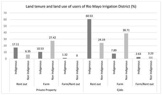 Figure 2. Land tenure and land use of users of Rio Mayo Irrigation District, Sonora, Mexico according to ethnicity. Rent out = rent their land to others who farm it; Farm = farm their own land. Source: original diagram.