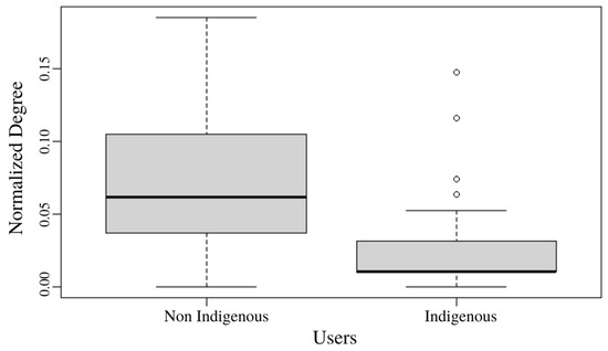 In order to compare the amount of information to which the indigenous and non-indigenous users had access, a Mann–Whitney U test was carried out [49] for non-parametric data with a 95% confidence level. For this, the normalized degree metric was used; see Table 1 for the description and interpretation of the metric.