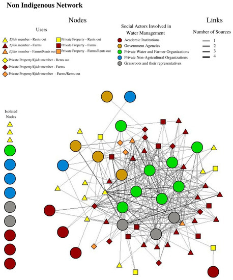 In both networks, social actors influencing water management that appear to be isolated in the diagram provided no information to users. Some of these are private non-agricultural organizations. Some academic institutions intermittently provided information when they were carrying out research in the region [52]. In the non-indigenous network, the Mayo government is also isolated. Furthermore, NGOs prove to be isolated, despite the fact that they have adopted the role of networking [53] (see Figure 4).