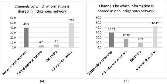 Finally, Figure 6 indicates that in both networks, informal discussion among social actors influencing water management and users is the principal means of communication; 49.7% of users in the indigenous network and 42.5% of those in the non-indigenous network stated that they participated in such discussion. Nevertheless, differences were found with respect to participation in water-use-related meetings; 40.3% of those in the indigenous network stated that they participated in such meetings, compared to 30.2% of those in the non-indigenous network, and only 4% of those in the indigenous network stated that they received printed water-use-related information, compared to 17.8% of those in the non-indigenous network.