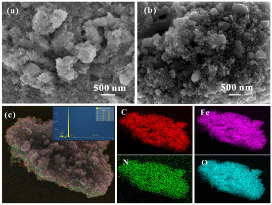 Figure 1 shows the scanning electron microscopic images (SEM) of the FCN-0 and the FCN-500 composites. The two materials are morphologically flocculent aggregates with non-uniform particle sizes. The pores of the FCN-0 are small in number and large in size. The FCN-500 shown in Figure 1b is tightly aggregated and clustered; the number of pores is significantly increased, and the particle size is smaller. The EDS data (Figure 1c) confirms the four elements of C, Fe, N, and O with a weight ratio of 2.5:7.7:0.4:2.5 (right top inset of Figure 1c) are uniformly distributed on the FCN-500. The Fe:O weight ratio of the FCN-500 (2.264) is higher than that of the FCN-0 (2.125, Figure S1), which is mainly caused by the decomposition of crystal water and some organic components during the calcination process.