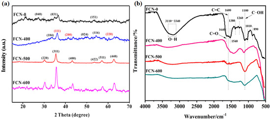 XRD patterns (a), FT-IR spectra (b) of the FCN-0, FCN-400, FCN-500, and FCN-600.