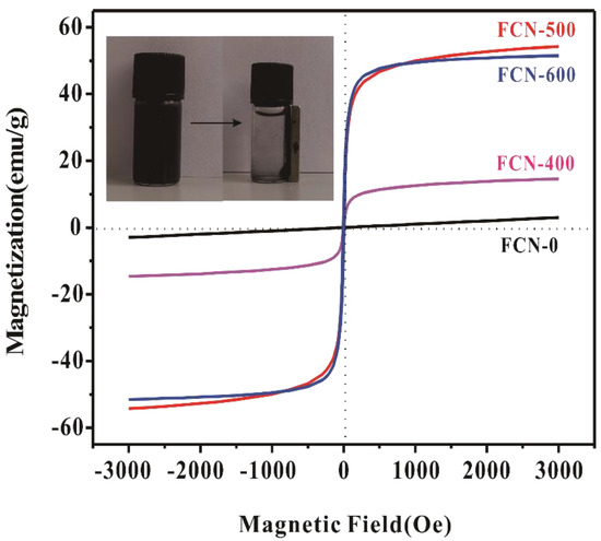 Figure 3 shows the magnetization curves of the FCN-0, FCN-400, FCN-500, and FCN-600 composites. The FCN-500 and FCN-600 exhibit typical ferromagnetic behavior, and the highest saturation magnetization value of the FCN-500 is about 54.3 emu/g. This is mainly because the organic components in the sludge are carbonized at high temperatures, and the Fe-containing substances in it are converted into magnetic Fe3O4. The high saturated magnetization of the FCN-500 facilitates its separation from the solution under an external magnetic field.