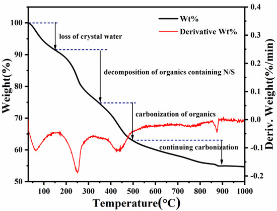 The thermal stability and composition of iron-containing coagulated sludge were studied in the temperature range of 30–1000 °C (Figure 4). The DTG curve showed three obvious weight loss stages during the heating process. The first stage occurred in the temperature range of 30–150 °C, which was mainly due to the loss of crystal water. In the second stage, in the temperature range of 150–350 °C, the weight decreased rapidly, mainly due to the thermal decomposition of organic matter containing nitrogen, sulfur, oxygen, and other elements in the coagulated sludge. The third stage of weight loss occurred at 350–500 °C, during which organics were further carbonized. Combining the XRD results and the magnetization curves, it can be inferred that FeOOH in iron-containing coagulated sludge was dehydrated and transformed into Fe2O3 in the temperature range of 30–350 °C. When the temperature was higher than 350 °C, Fe2O3 was reduced to FeO by C in the sludge, and gradually converted to Fe3O4.