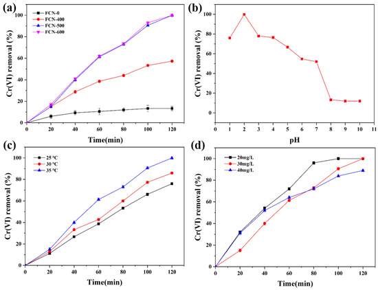 The removal of Cr(VI) by different adsorbents. (a) Effect of different adsorbents (T = 35 °C, pH = 2, [Cr(VI)] = 30 mg/L, [Adsorbents] = 0.8 g/L). (b) Effect of the pH value (T = 35 °C, [Cr(VI)] = 30 mg/L, [FCN-500] = 0.8 g/L). (c) Effect of the temperature (pH = 2, [Cr(VI)] = 30 mg/L, [FCN-500] = 0.8 g/L). (d) Effect of the initial Cr(VI) concentration (T = 35 °C, pH = 2, [FCN-500] = 0.8 g/L).