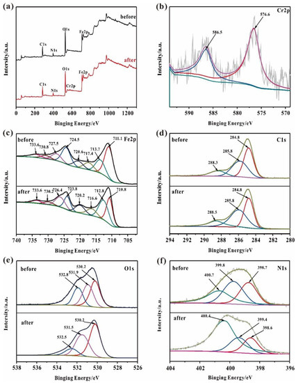 XPS is a characterization analysis method to confirm Cr(VI) reduction on FCN-500 by measuring element species. As shown in Figure 6 of the scan spectra, the distinct peaks observed correspond to Fe 2p, C 1s, N 1s, O 1s, and Cr 2p. Cr(VI) adsorption on FCN-500 is confirmed by the presence of the Cr 2p peak (Figure 6a). In Cr 2p, the peaks at 576.6 and 586.5 eV were marked as Cr 2p3/2 and Cr 2p1/2 of Cr(III) (Figure 6b) [46,47]. The presence of Cr(III) indicates subsequent Cr(VI) reduction. The Fe2p peak is mainly divided into Fe2p3/2 and Fe2p1/2, which were located at 711.7 eV and 724.6 eV, respectively (Figure 6c). The Fe 2p3/2 peak is located at 711.7 eV, indicating Fe3O4 in FCN-500, which is consistent with the results of the XRD analysis [48]. The peak corresponding to the C 1s peak shows indifferent behavior in all samples. In the binding spectrum of C1s, the peaks at 284.8 eV, 285.8 eV and 288.3 eV correspond to the C-C/CHx, -C-OR and N-C=N bonds, respectively (Figure 6d) [49,50]. In the O 1s peak (Figure 6e), before Cr(VI) adsorption, O1s has three XPS peaks with binding energies at 530.2 eV, 531.9 eV, and 532.8 eV, which are assigned to Fe-O, C-O, and C=O groups [51]. After Cr(VI) adsorption, the O1s spectrum has fitted into three peaks with the binding energies at 530.2 eV, 531.5 eV, and 532.5 eV, which are assigned to Fe-O, C-O, and C=O groups. After adsorption, the peak intensity of C=O is decreased. The results showed that some of the C=O in FCN-500 had been oxidized to C-O after the adsorption of Cr(VI), indicating that a redox reaction occurred during the adsorption process [27]. The high-resolution spectrum at N 1s shows three peaks at 398.7, 399.8, and 400.7 eV, attributed to =N–, –NH–, and N+ (=N–+ and –NH–+), respectively. After Cr(VI) adsorption, the N+ content increased significantly, whereas the total amount of = N– and –NH– decreased. The results show that part of nitrogen on FCN-500 is further protonated under acidic conditions, and the non-protonated nitrogen is significantly reduced (Figure 6f) [27].