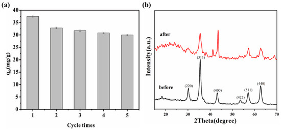 After adsorption-reduction, chromium occurs on FCN-500 as Cr(III). The regeneration of reactive sites was carried out using 1 M NaOH for 12 h (each cycle). After five adsorption-desorption cycles (Figure 7a), the adsorption capacity of FCN-500 decreased slightly, reaching about 80% optimal capacity. As the number of regenerations increased, the adsorption capacity declined after the third regeneration step. The adsorption capacity of the regenerated FCN-500 remained unchanged after five cycles. The XRD patterns of fresh and used FCN-500 were also collected as shown in Figure 7b. Results suggested that after five cycles of adsorption-regeneration, the basic structure of FCN-500 was well maintained, proving its good regenerative adsorption performance of FCN-500. In addition, a new peak near 42° was observed for the used FCN-500, which can be associated to the crystal plane of some Cr-N-Fe species, indicating that Cr interacted with nitrogen groups on FCN-500 [54]. This result also proved the proposed mechanism, that nitrogen-containing groups were the active sites for Cr adsorption.