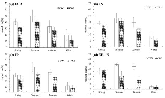 The highest seasonal average removal rates were obtained for all examined pollutants in the summer period in CW1 and the general trend was that all R% values in both CW1 and CW2 were significantly higher in spring, summer and autumn than in winter (Figure 1). The R% values of COD (Figure 1a), TN (Figure 1b) and TP (Figure 1c) in winter in both units were extremely low, while that of NH4+-N (Figure 1d) in CW2 even went down to below 10%. Similar to that shown in Table 1, the CW1 system had significantly higher pollutant removal rates than the CW2 system in all seasons with NH4+-N in spring as an exception.