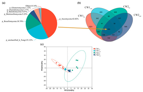 The composition percentage of the identified fungal phyla was shown in Figure 2a. The top dominant phyla of the common OTUs found in both CW units were Ascomycota (42.82%), (25.12%) and Rozellomycota (18.70%), and the sum of their percentages amounted to more than 85% of the total OTU number.
