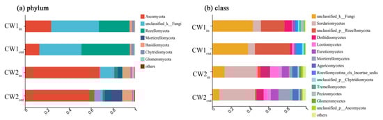 Eight fungal phyla were identified in both of the CW units, among which, unclassified_k_Fungi, Rozellomycota and Ascomycota, listed in the descending order of relative abundance, were the dominant phyla in CW1, while Ascomycota, unclassified_k_Fungi, Basidiomycota and Mortierellomycota were the dominant phyla in CW2 (Figure 3a). The sum of the relative abundance of the listed dominant phyla reached, respectively, 95.15% and 94.06% of the total value in CW1 and CW2. Due to a lack of annotation information, a number of unannotated fungal species were denoted as unclassified fungi.