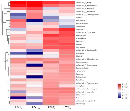 The same as those observed at phylum and class levels, significant differences in the relative abundance of genera were clearly noted between the two established CW units. Among the 35 genera shown in Figure 4, the genera possessing a relative abundance higher than 2 × 10−2 (the color gradient indicating the levels of relative abundance in Figure 4) observed at the inlet of CW1 were unclassified_k_Fungi, unclassified_p_ Rozellomycota, unclassified_o_Branch02, Eleutherascus, Paraconiothyrium, Gibellulopsis, unclassified_p__Chytridiomycota and Pyrenochaetopsis. In contrast, more genera possessing higher relative abundance values were found at the inlet of CW2 than that of CW1. In addition, most of the top abundant genera in CW2 were different from those in CW1, except for unclassified_k_Fungi, unclassified_p_Rozellomycota, unclassified_p__Chytridiomycota and Pyrenochaetopsis. The genera Mortierella and Pseudeurotium, for example, were two of the top abundant genera in CW2, while their relative abundance values were very low in CW1 (Figure 4).