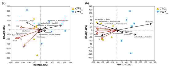 Redundancy analysis (RDA) of fungal genera in CW1 (a) and CW2 (b). (Note: the dot indicates the sampling site. The length of the arrow denotes the correlation level. The angle between the red and black arrows lower or higher than 90o denotes the presence of a positive or a negative correlation. CW1 and CW2 refer to the treatment systems defined in Table 1.).